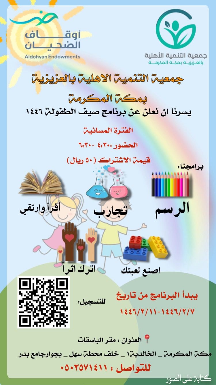 أقامت جمعية التنمية الأهلية بالعزيزية بمكة “برنامج صيف الطفولة” ضمن باقة امرح وتعل ويهدف البرنامج إلى تنمية وتطوير المهارات لدى الأطفال بمساعدتهم على التعبير لما يدور بداخلهم بطريقة صحيحة وأسلوب راقي بالإضافة إلى منحهم الثقة في أنفسهم”